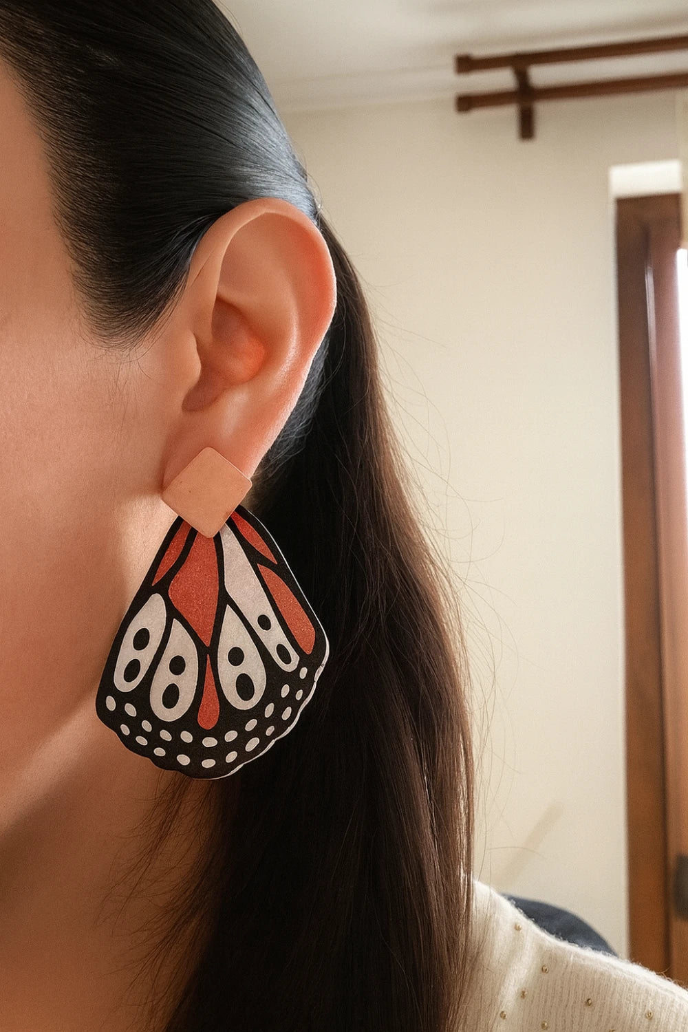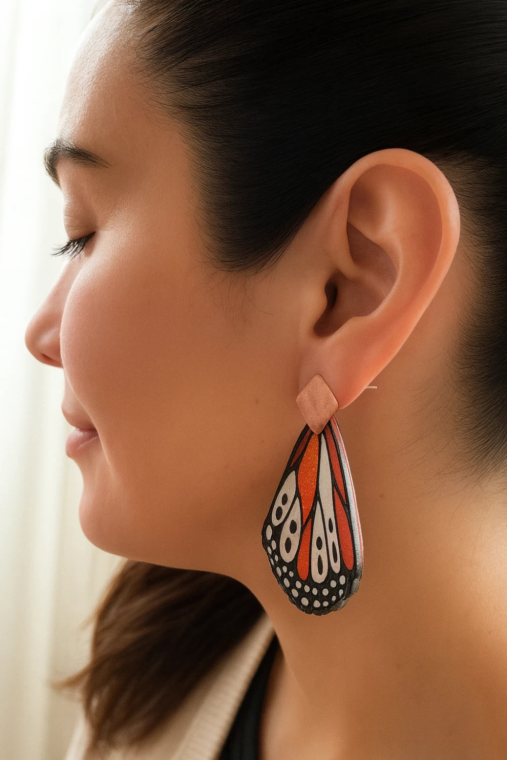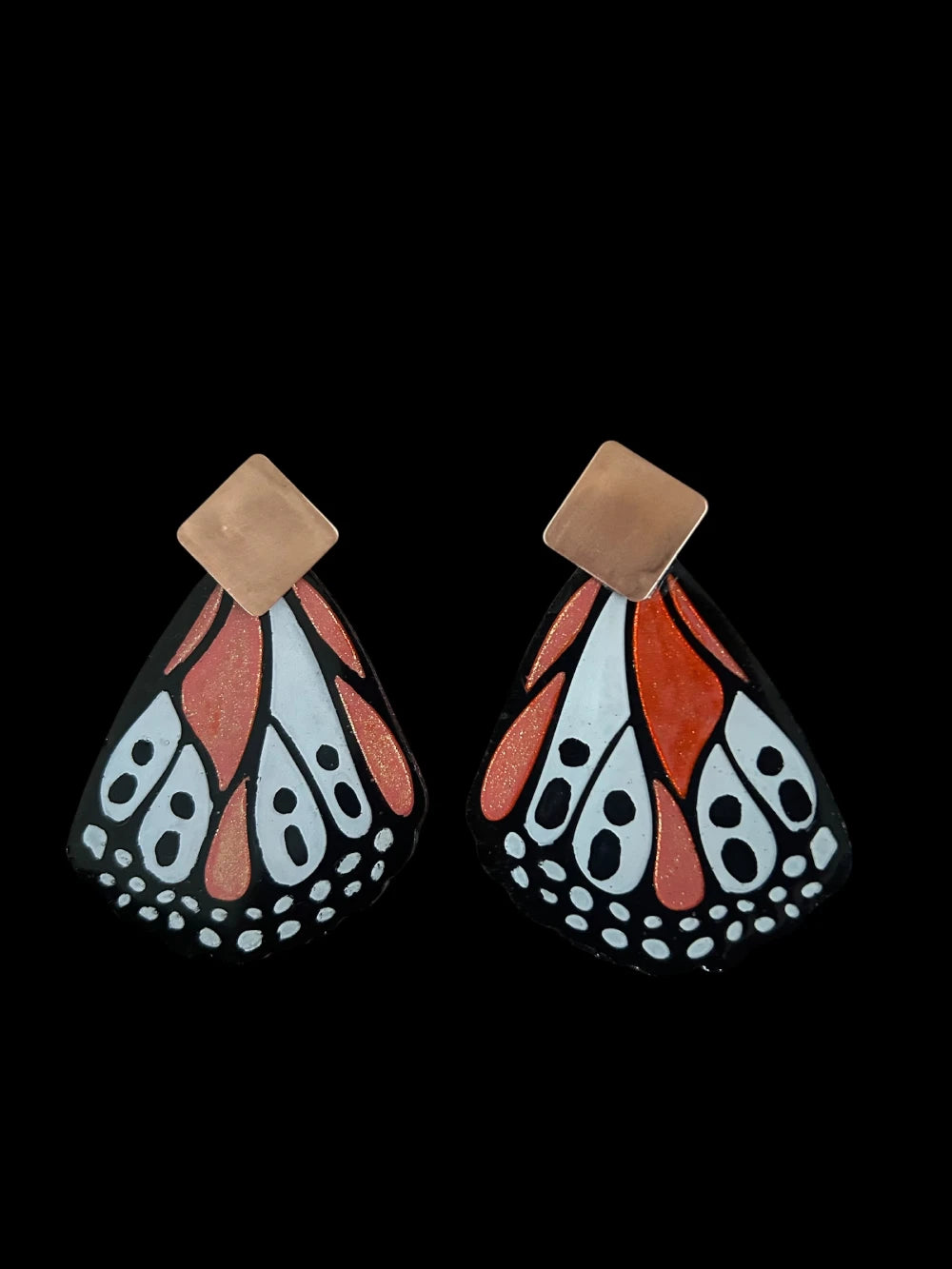 Los Aros de Mariposa Isabella evocan la magia de la transformación y la libertad. El diseño inspirado en las alas de una mariposa transmite ligereza, movimiento y un aire poético de renacimiento. El contraste entre el negro profundo de los bordes y los tonos cálidos anaranjados con destellos brillantes aporta vitalidad, recordando la energía del sol y la naturaleza en su máximo esplendor. Al llevarlos, la persona proyecta alegría, frescura y una conexión con la belleza orgánica del mundo natural, como si llevara consigo un pequeño fragmento de alas listas para volar.