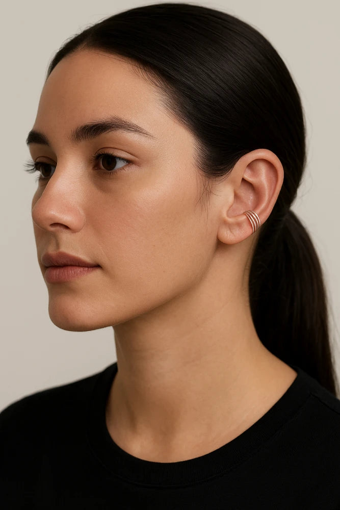 Este arete o pendiente transmite modernidad, libertad y estilo personal. Su diseño multiparo paralelo simboliza equilibrio y armonía, como si cada línea representara un camino distinto que converge en un mismo punto de identidad.
