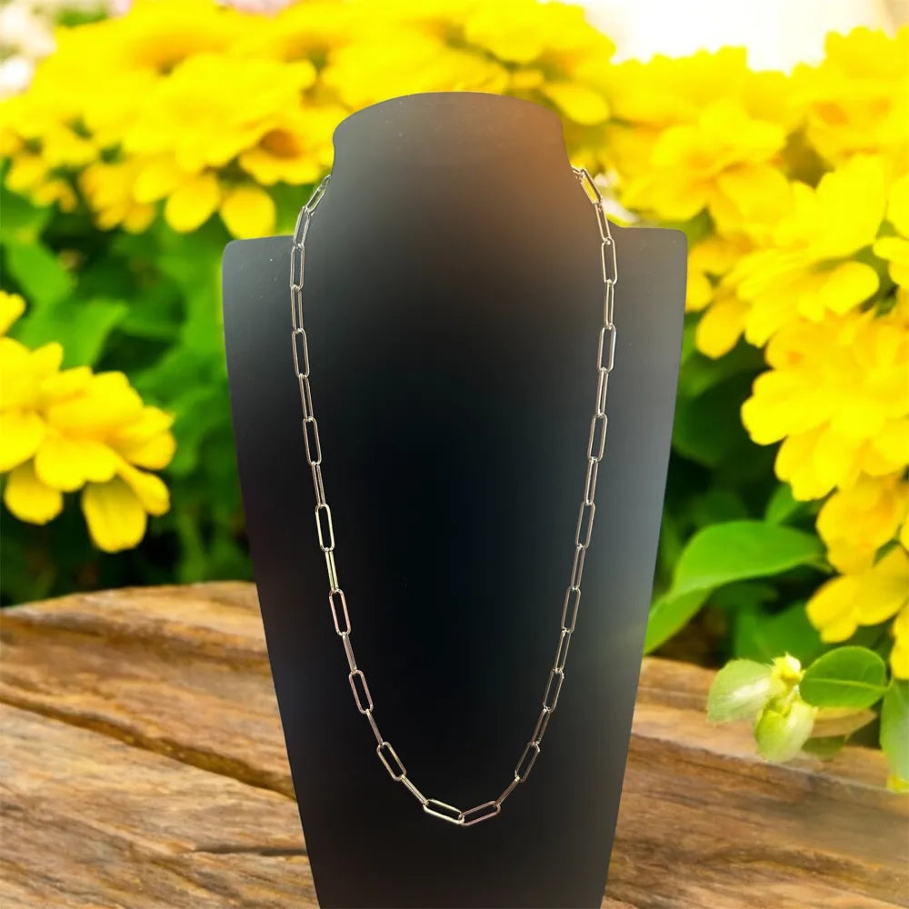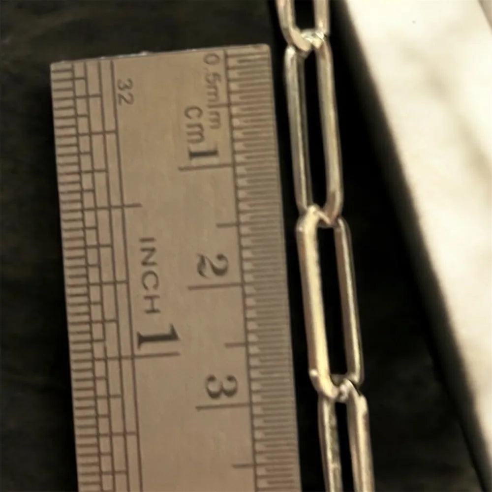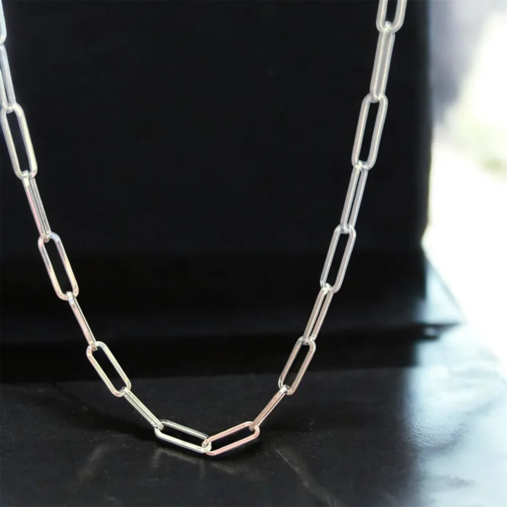 Cadena de Plata 925 Blanca Esta cadena transmite una sensación de elegancia y fuerza. Sus eslabones rectangulares y grandes, perfectamente alineados, evocan orden, claridad y determinación. Es una pieza que no requiere adornos adicionales para destacar.