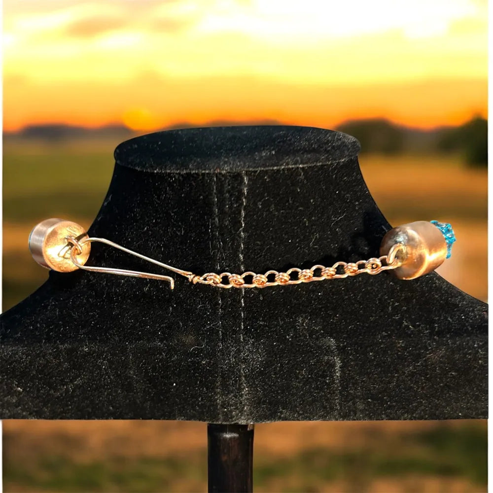 En sus extremos piezas de cobre protegidas con laca transparente para metales, unidos con gancho y cadena elaborada a mano en alambre de cobre de 0,8 mm de espesor.