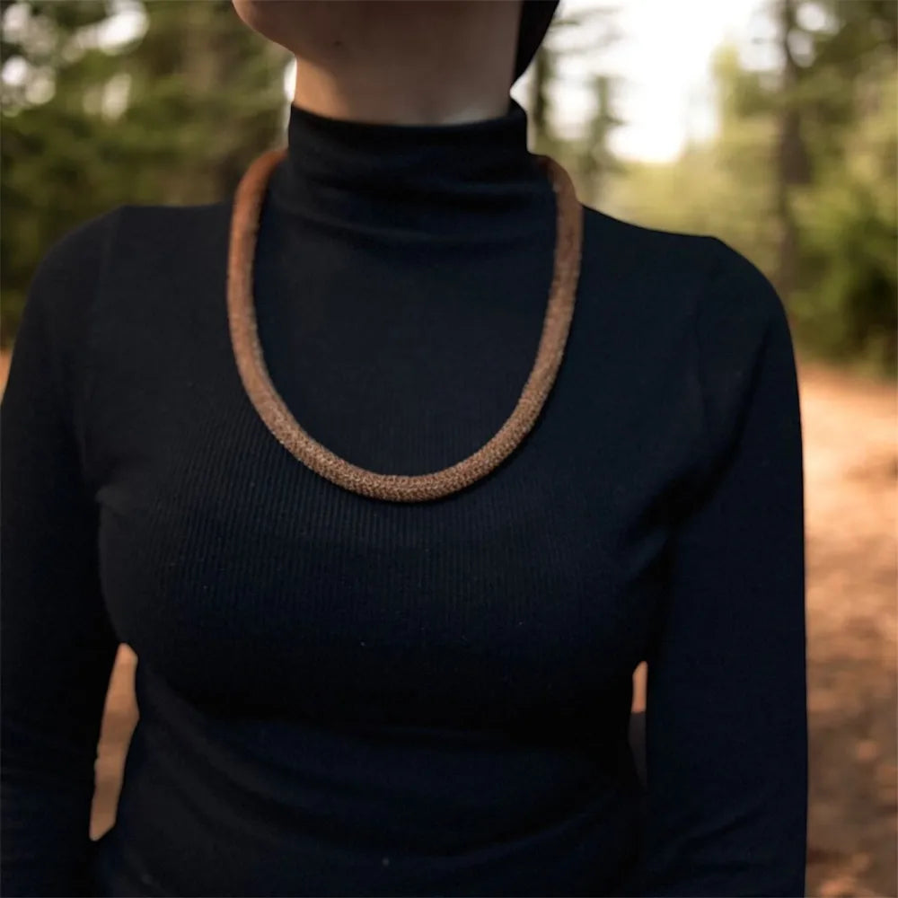 En un collar versátil, ya que permite su utilización centrándose en el cobre o bien en su tejido entrelazado con filamentos textiles.