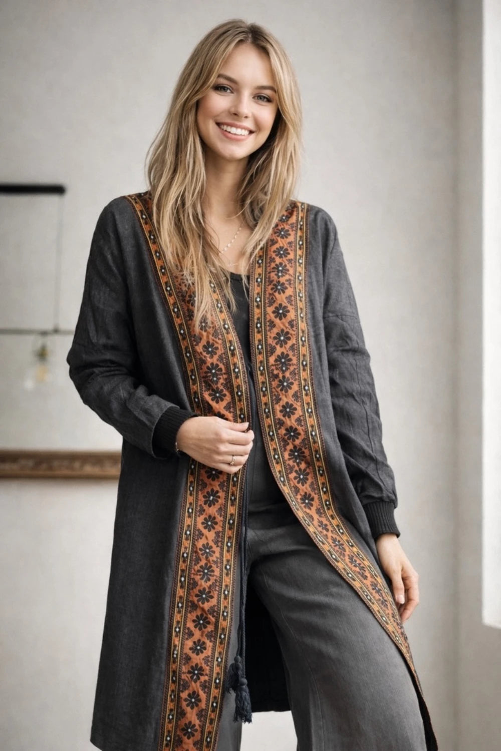Tapado Boho de corte elegante y versátil, perfecto para las estaciones de otoño e invierno. Confeccionado con materiales de calidad, este abrigo combina comodidad y estilo bohemio, ideal para crear looks sofisticados en cualquier ocasión. Su diseño fluido y detalles artesanales lo convierten en una pieza imprescindible para tu guardarropa de temporada. Fácil de combinar con diferentes prendas, aporta calidez y personalidad a tus outfits diarios.
