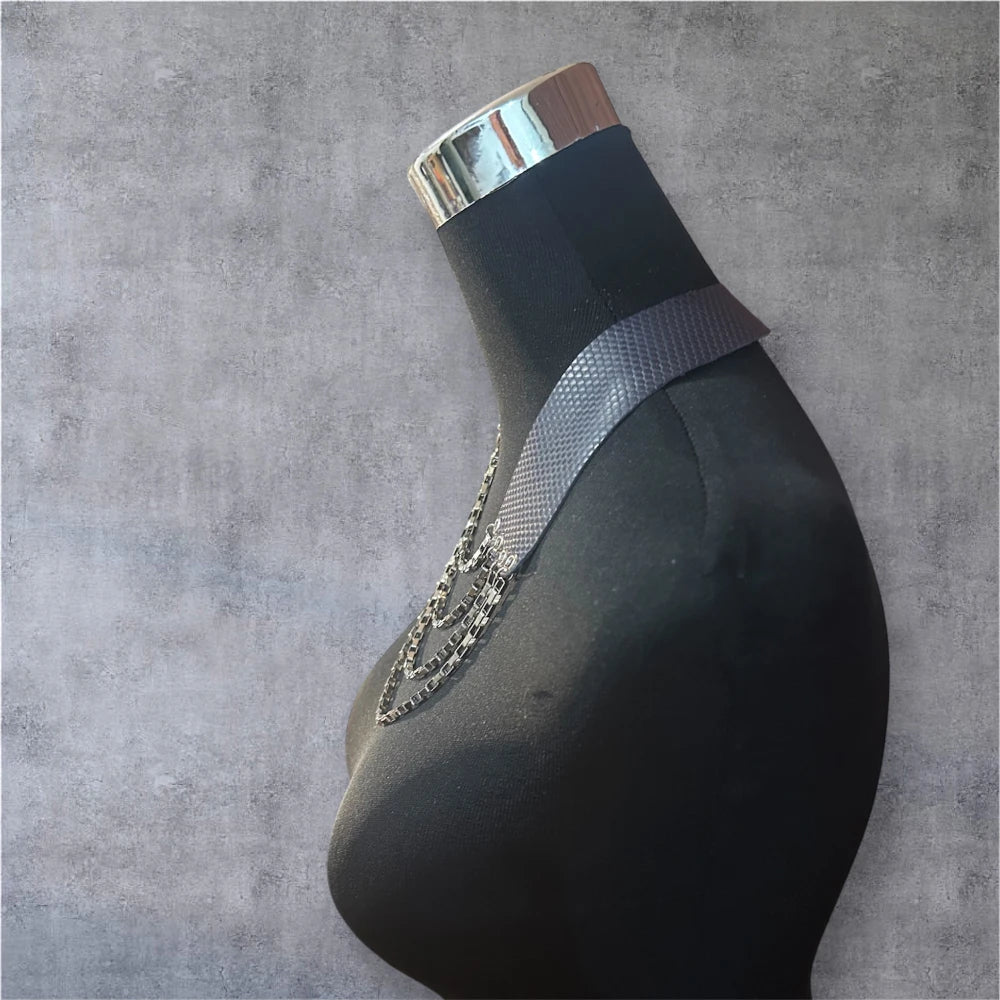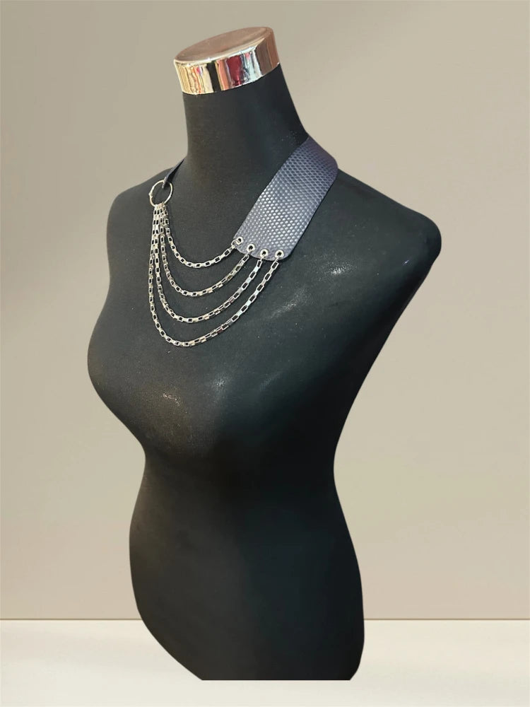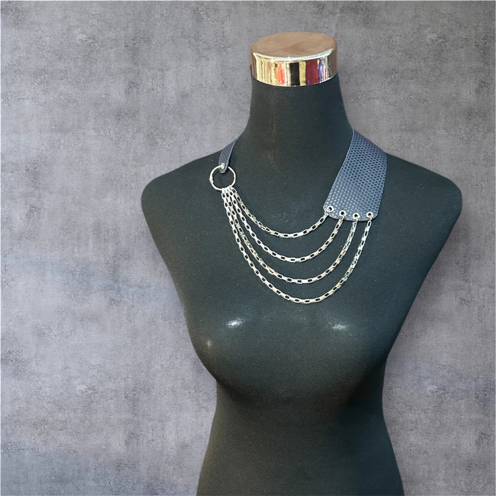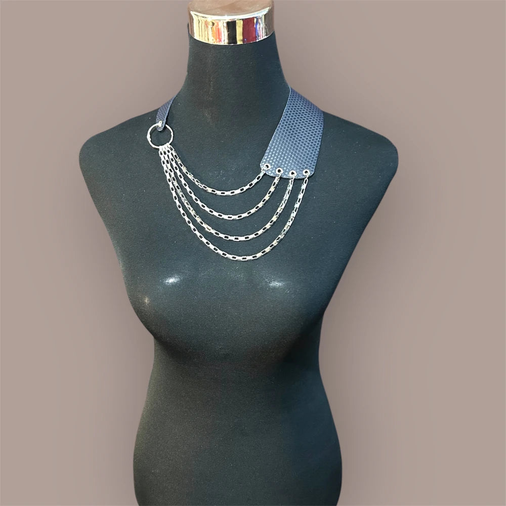 El collar está confeccionado a mano con cuero texturizado, que sirve de base para sostener una estructura de cadenas de acero quirúrgico, conocido por su alta resistencia a la corrosión y durabilidad.