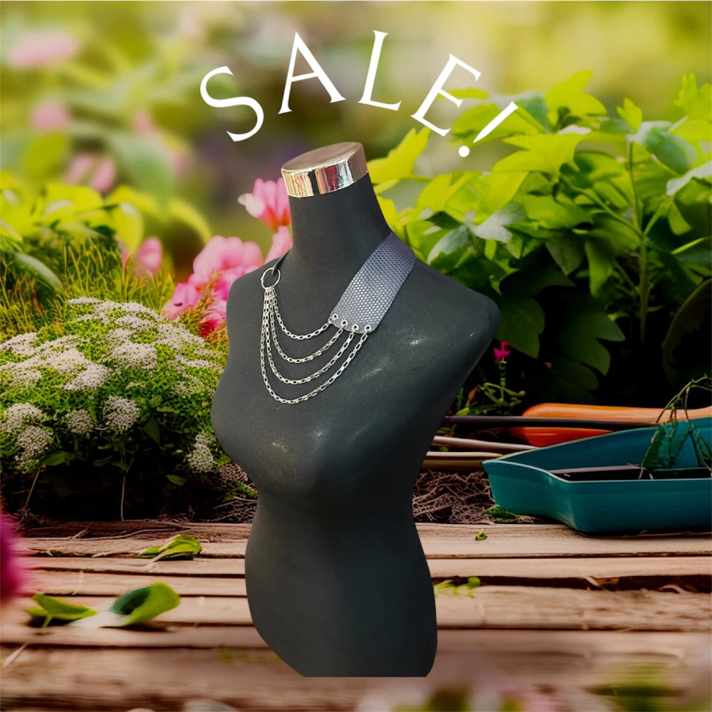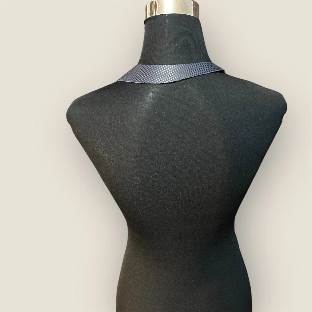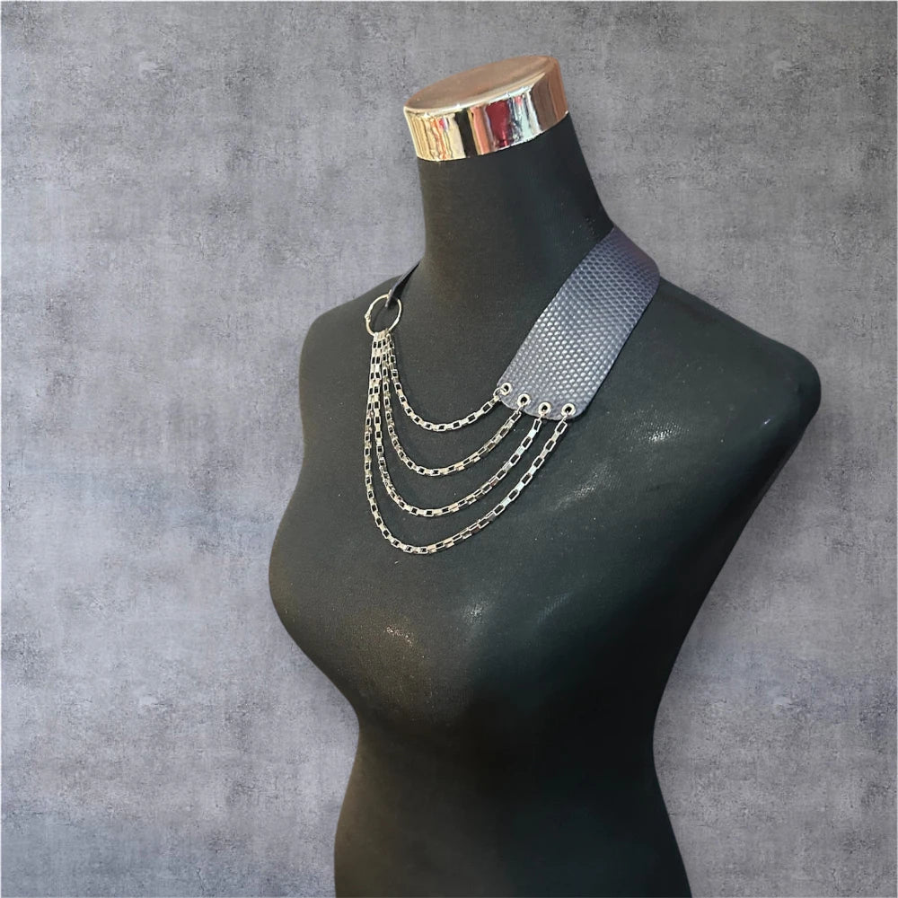 El collar está confeccionado a mano con cuero texturizado, que sirve de base para sostener una estructura de cadenas de acero quirúrgico, conocido por su alta resistencia a la corrosión y durabilidad.