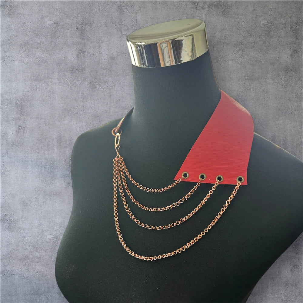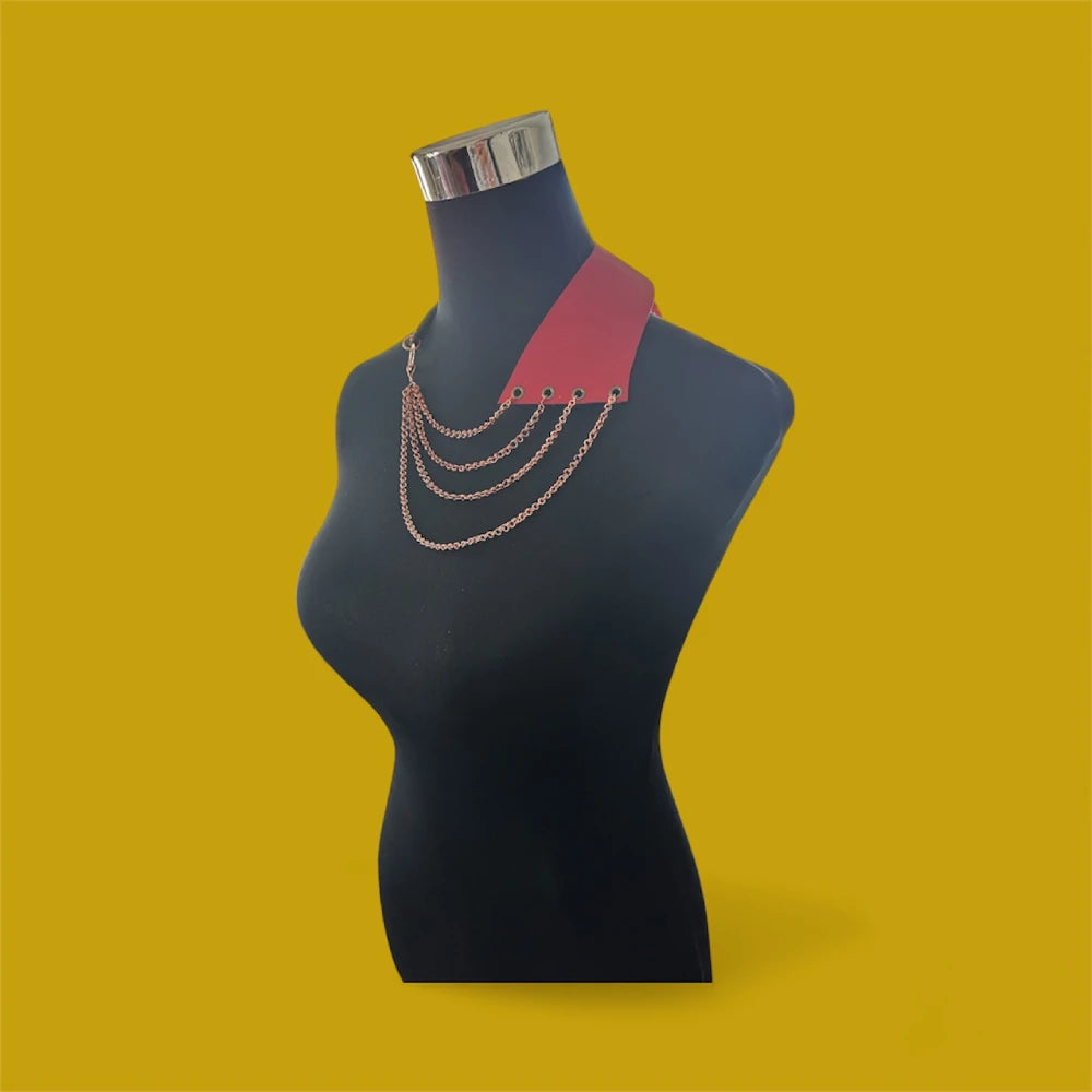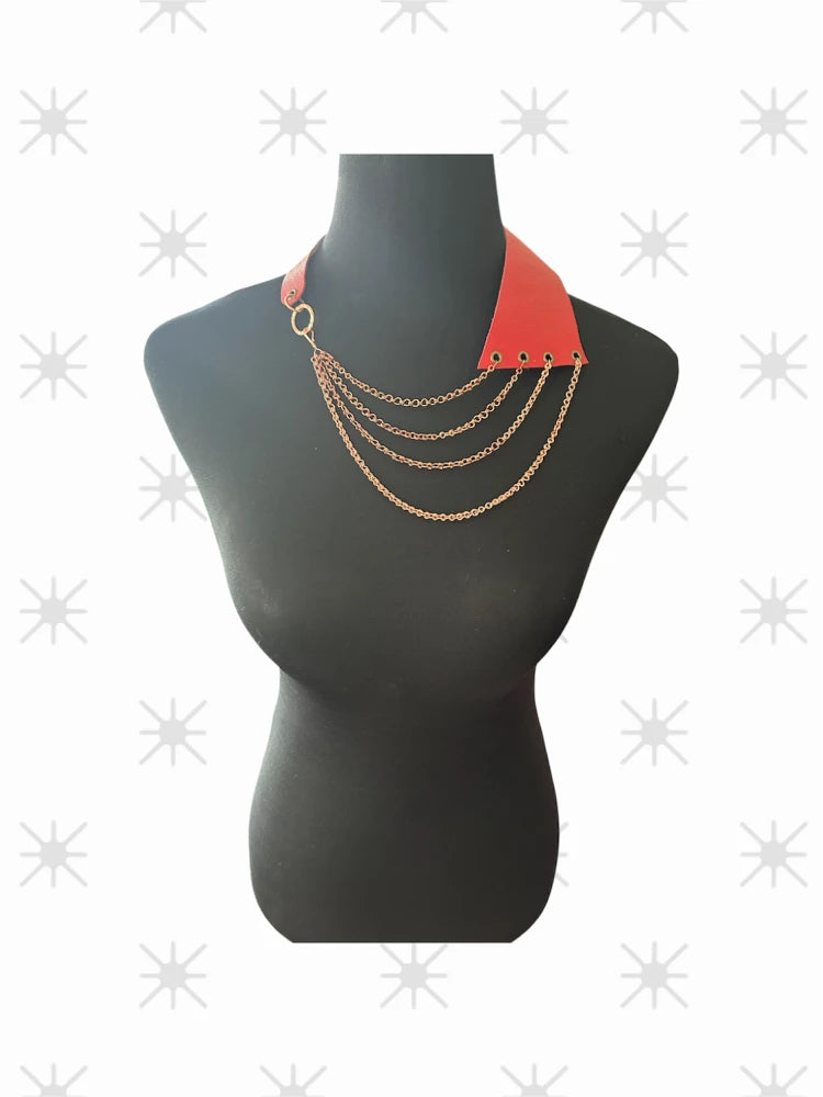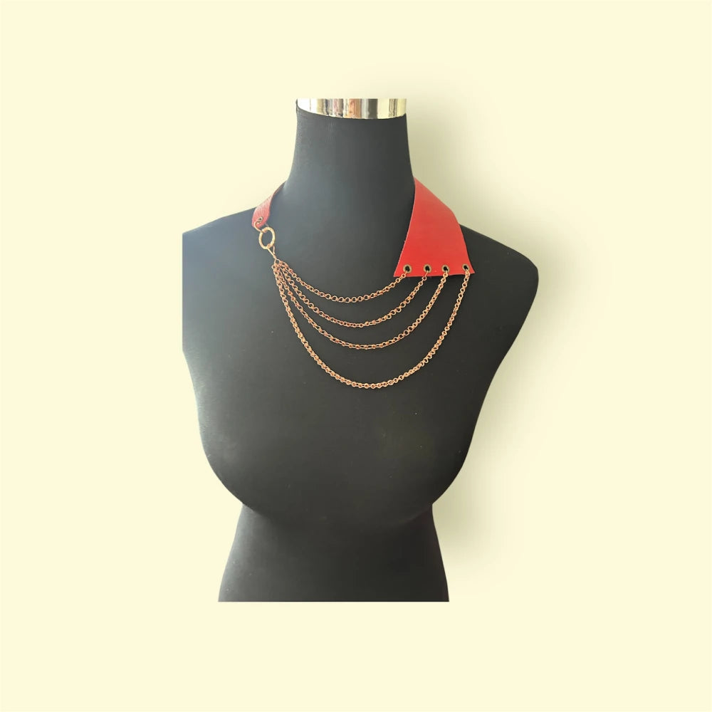Este collar es una pieza que irradia fuerza y carácter. La mezcla del cuero rojo intenso con las cadenas de cobre crea un contraste que transmite pasión y determinación, como un grito de libertad que se lleva sobre el pecho. Las caídas en cascada de las cadenas evocan movimiento y fluidez, recordando que la vida es un vaivén constante entre firmeza y suavidad. Es un accesorio que no solo adorna, sino que potencia la presencia, pensado para mujeres seguras de sí mismas, con un estilo atrevido y auténtico, que desean destacar y dejar huella en cada paso que dan.