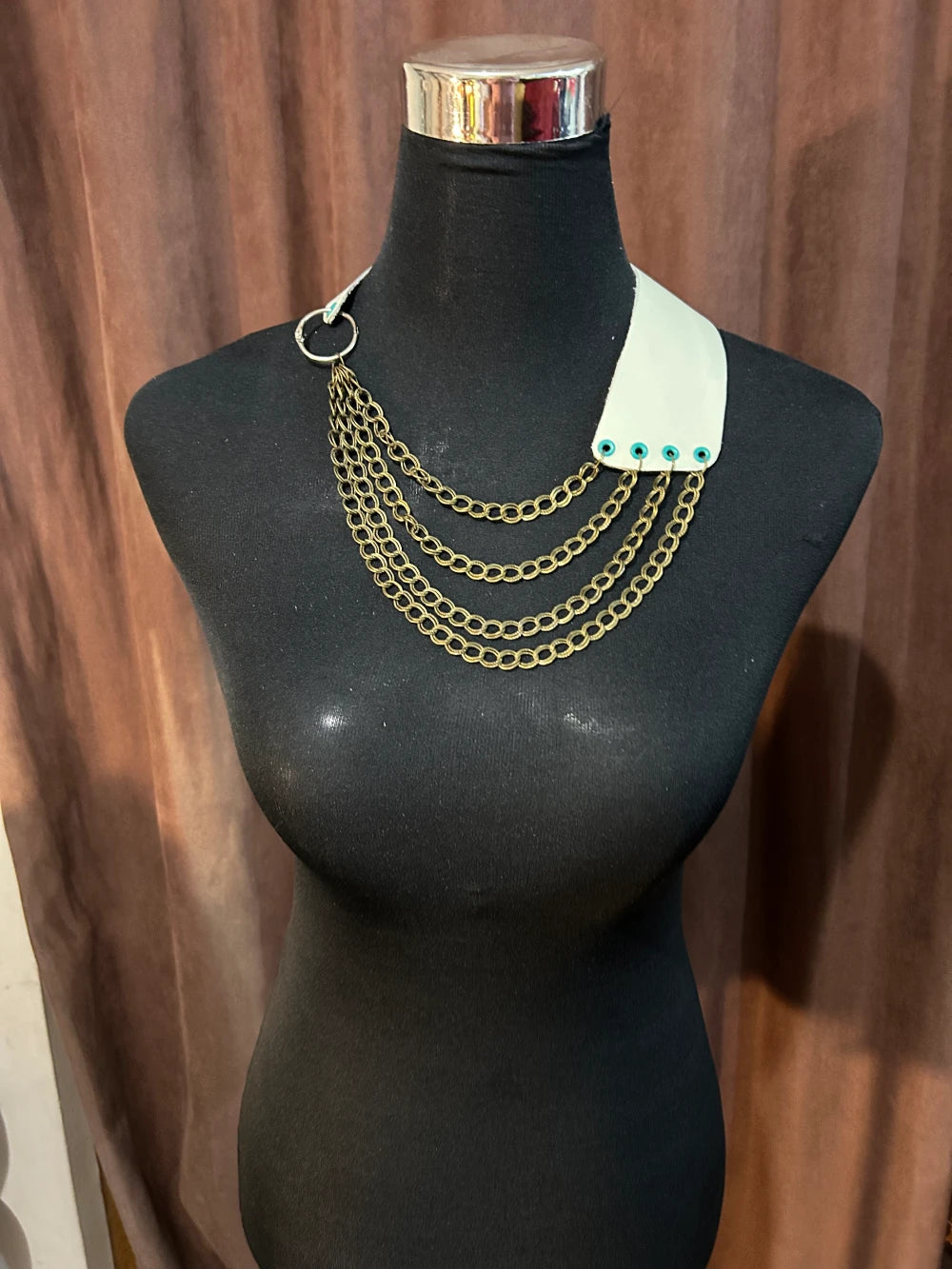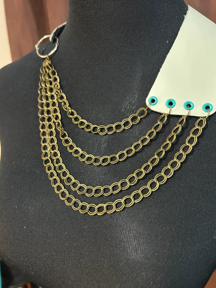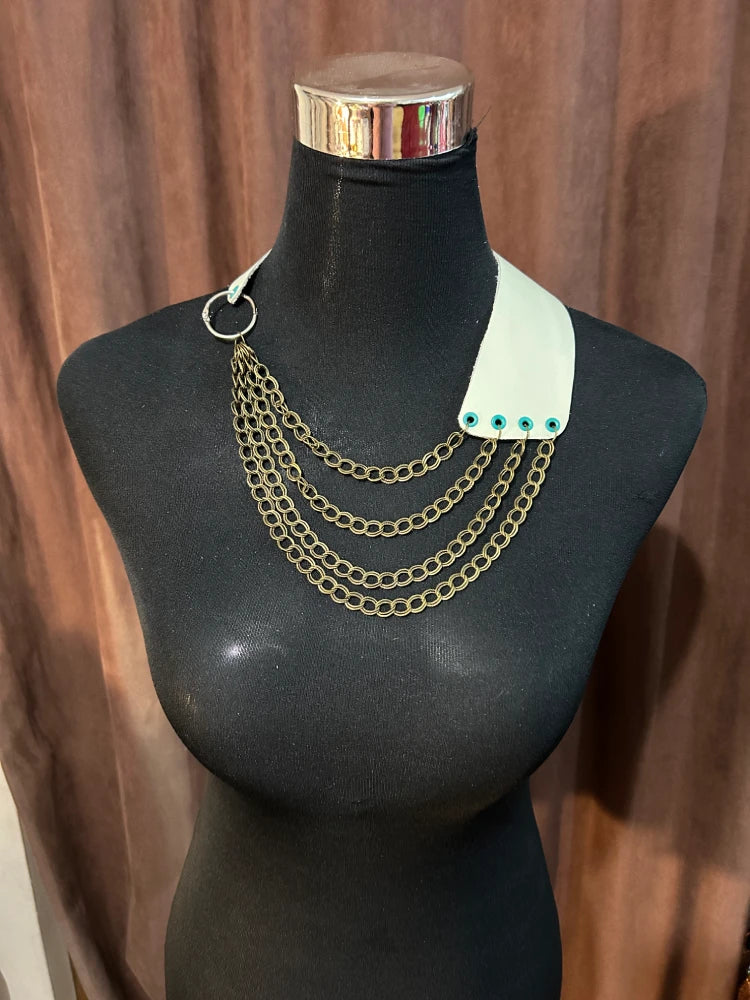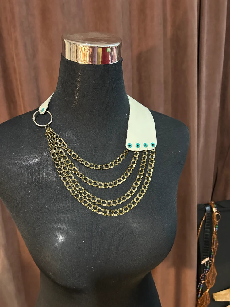Collar artesanal confeccionado en cuero color menta suave natural, trabajado a mano con terminaciones precisas. Presenta una estructura asimétrica que une una base de cuero con ojetillos metálicoscolor verde en uno de los extremos, y un aro metálico de unión en el otro, desde donde cuelgan cuatro cadenas de eslabonesovalados en tono bronce envejecido. Las cadenas están dispuestas en caída progresiva, generando movimiento y volumen.