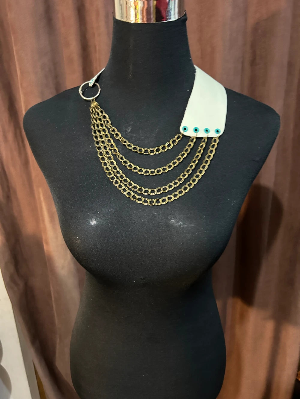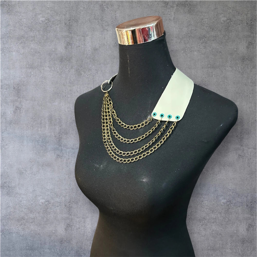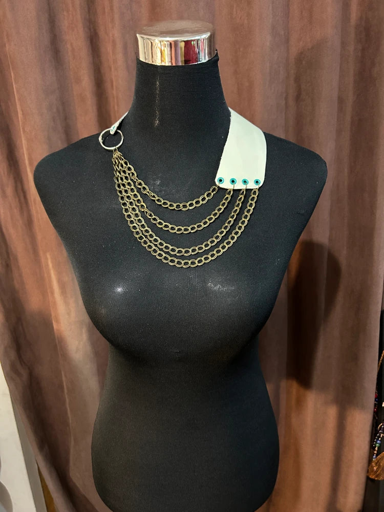 Este collar proyecta una fuerza moderna y segura, evocando a una mujer que no teme destacar y que abraza su autenticidad con elegancia. Las cadenas que caen en capas representan la conexión entre distintas etapas de la vida, mientras que la base de cuero menta sugiere pureza, equilibrio y un estilo vanguardista. Es una pieza que combina lo urbano con lo sofisticado, ideal para quien busca expresar independencia y creatividad sin perder la armonía visual.