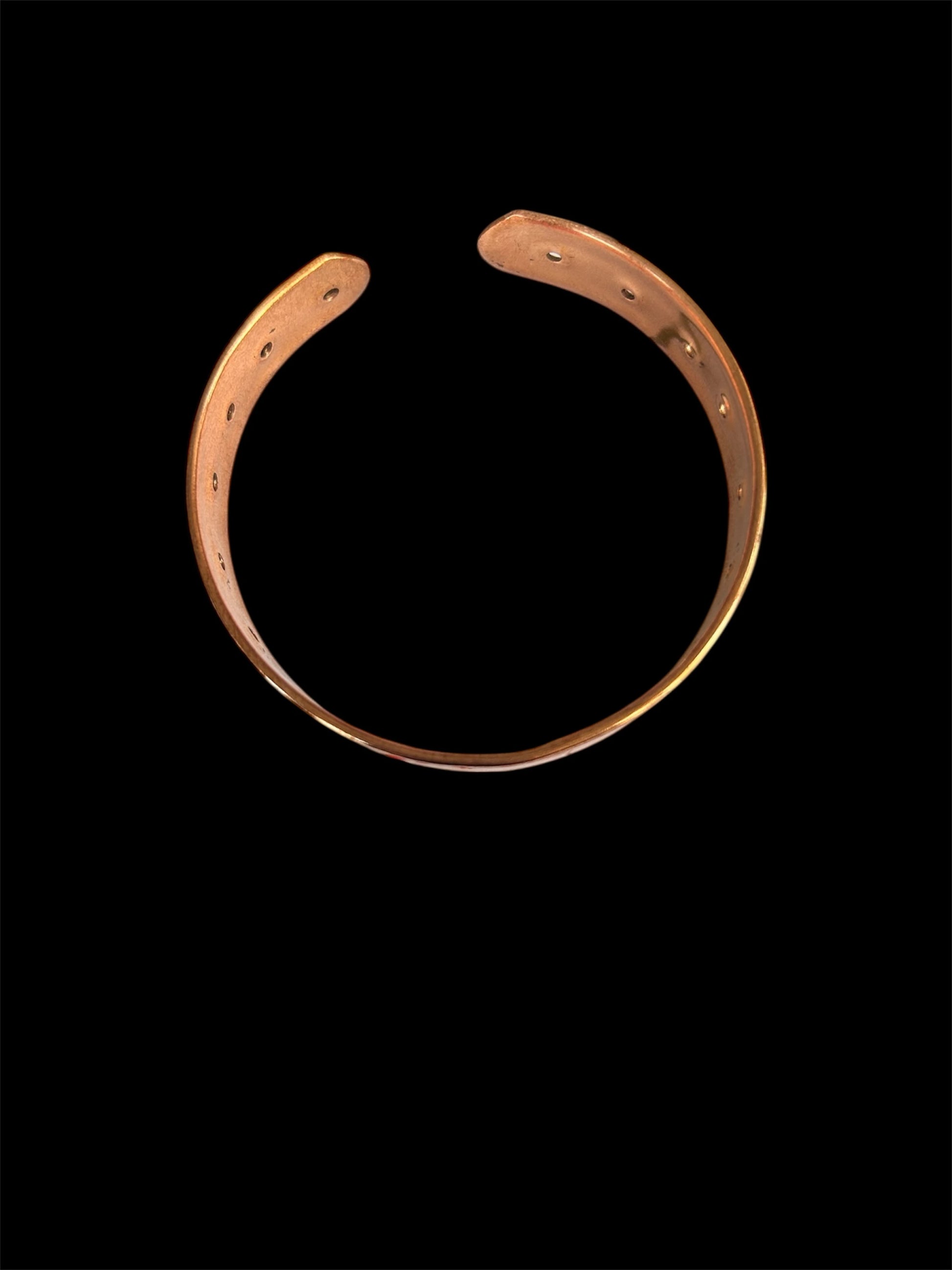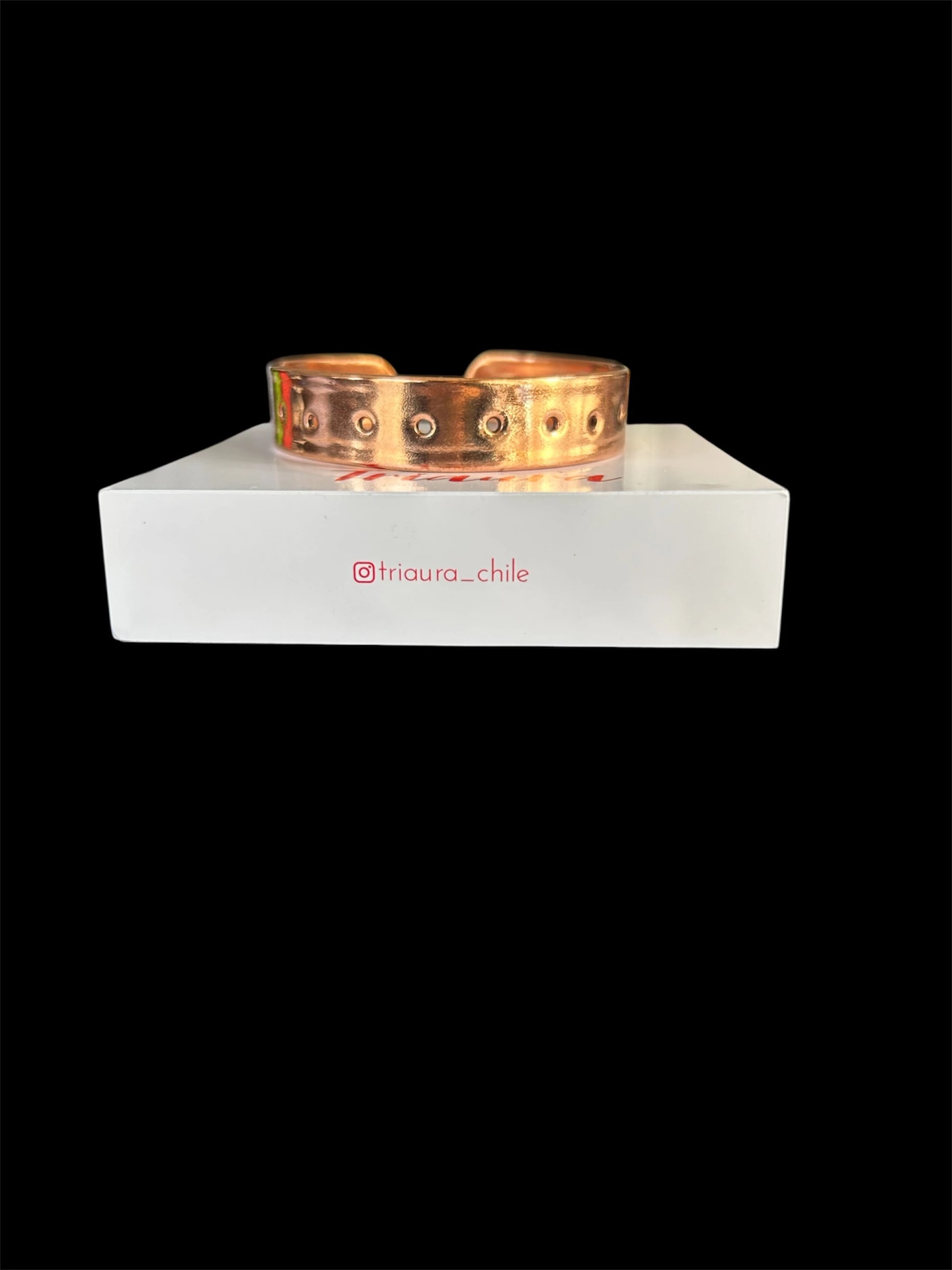 La Pulsera de Cobre Leocadia Texturada B Triaura , es una pulsera tipo esclava completamente de cobre, con su forma abierta y texturada con perforaciones hecha  a mano mediante golpes uno a uno.
